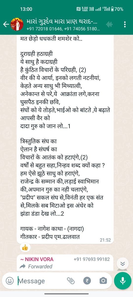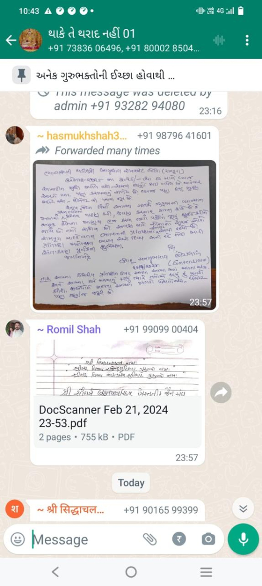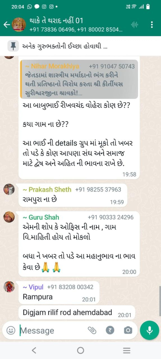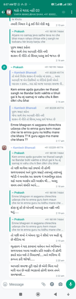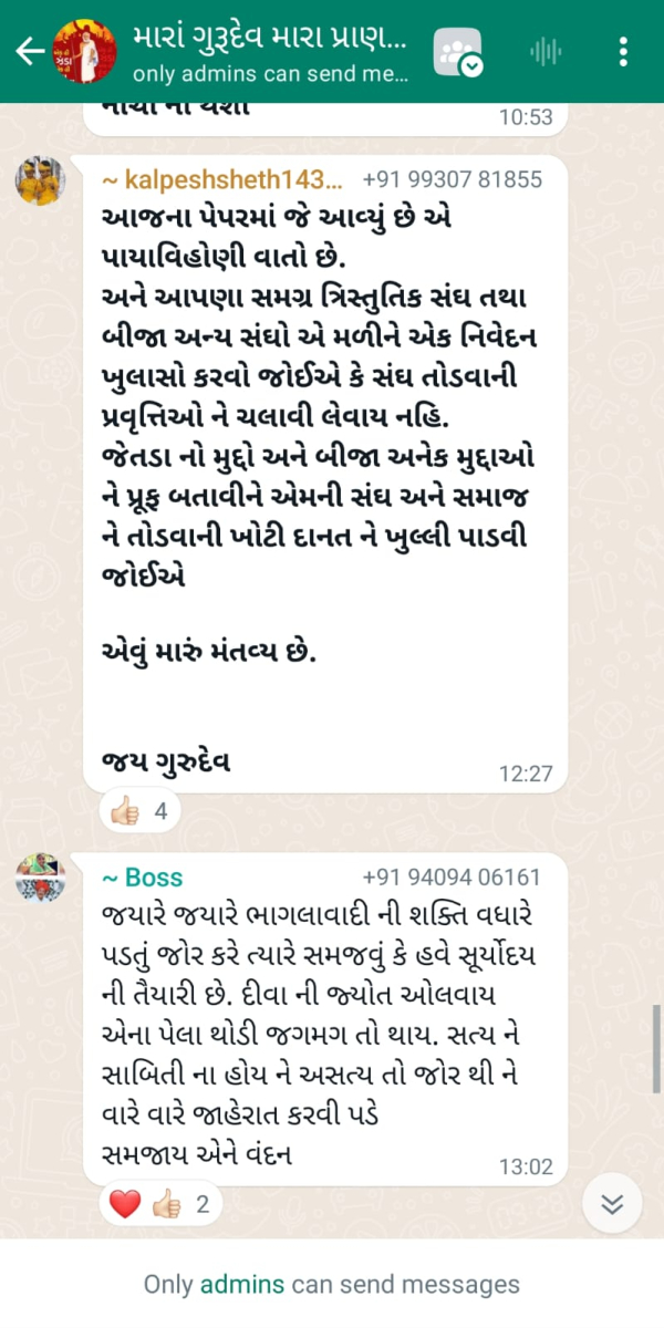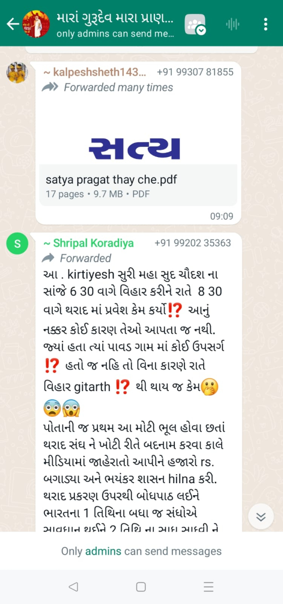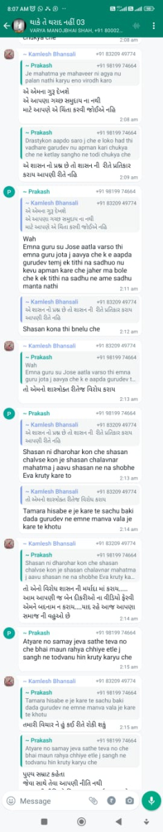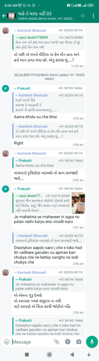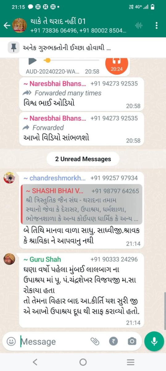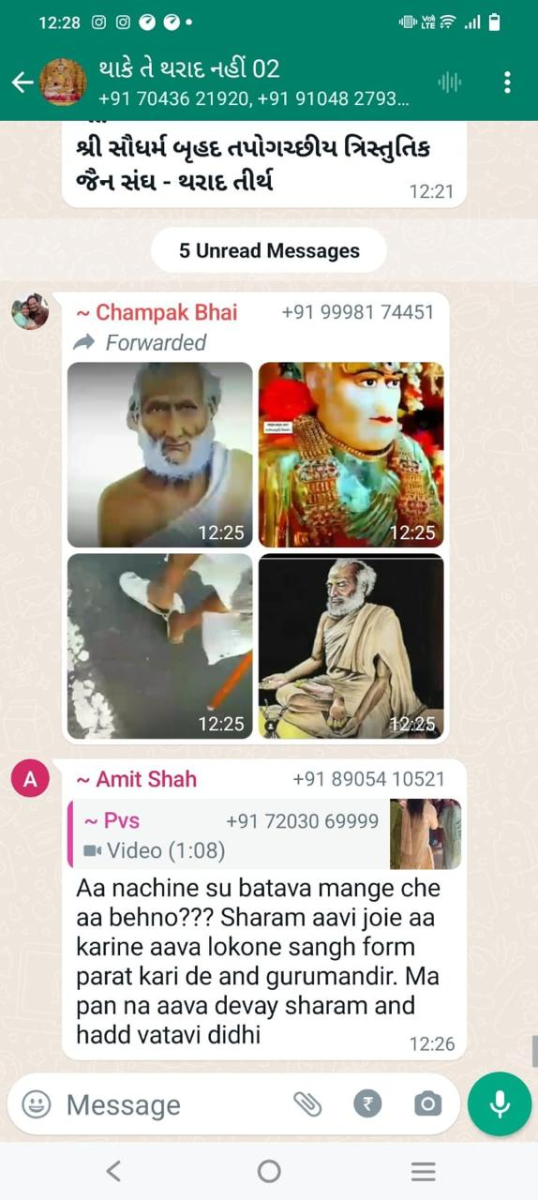 સાવ નીચલી કક્ષાના ઉશ્કેરણીજનક મેસેજના સ્ક્રીનશોટ ત્રિસ્તુતિક સમાજના નેજા હેઠળ ચાલતાં થાકે તે થરાદ નહીં, મારા ગુરુદેવ પ્રાણ પ્યારા થરાદ આદિ અલગ અલગ ગ્રૂપમાં બે તિથિ પક્ષ અને જૈનાચાર્ય માટે અનાર્યને પણ ના શોભે એવાં સાવ નીચી ભાષાના ઉશ્કેરણી જનક લખાણો….