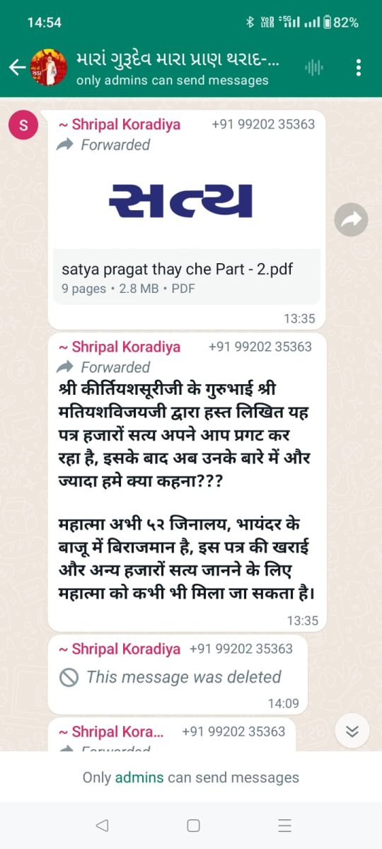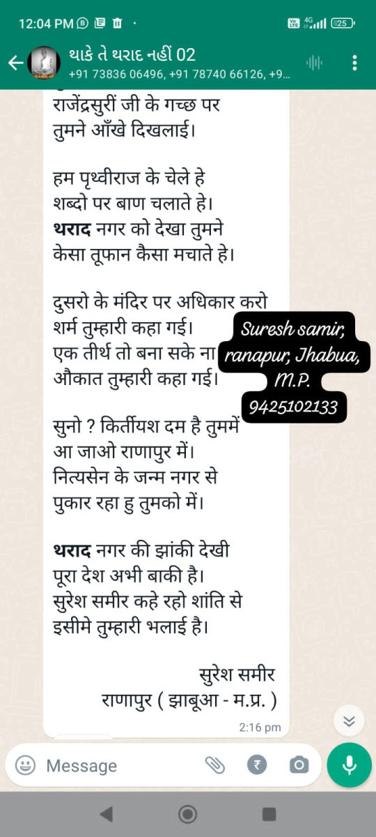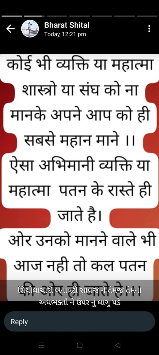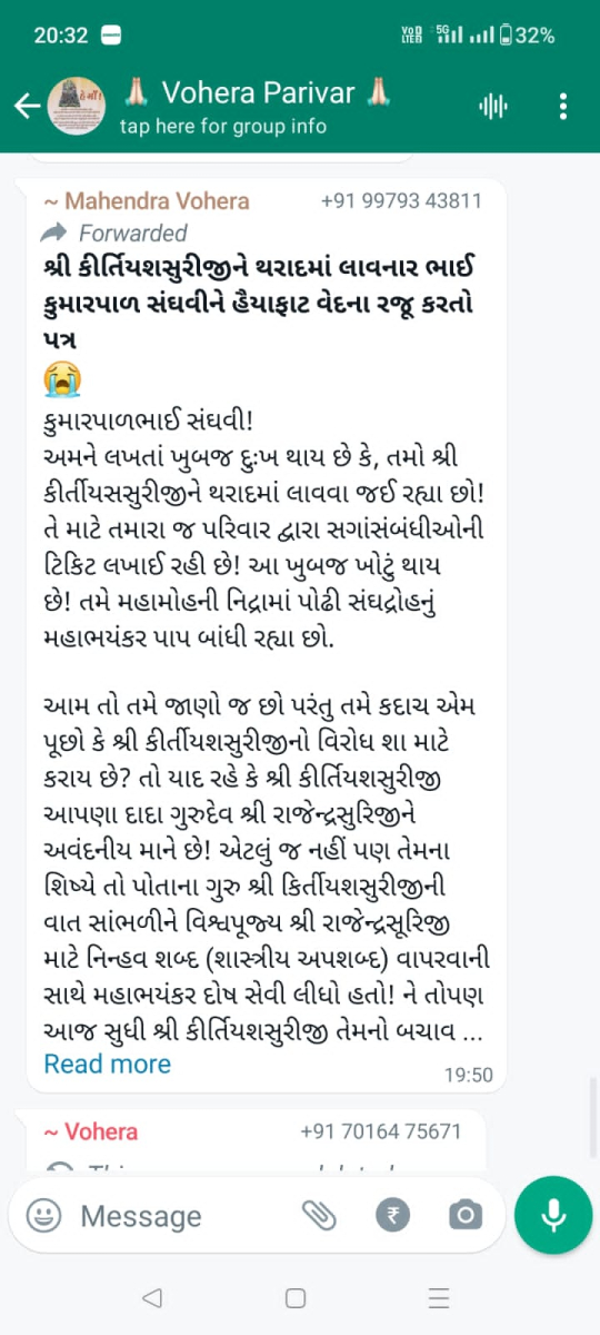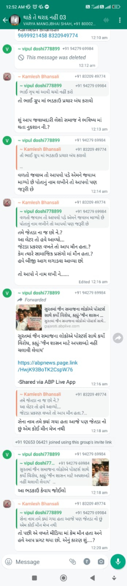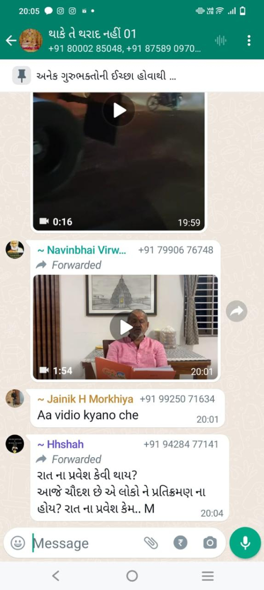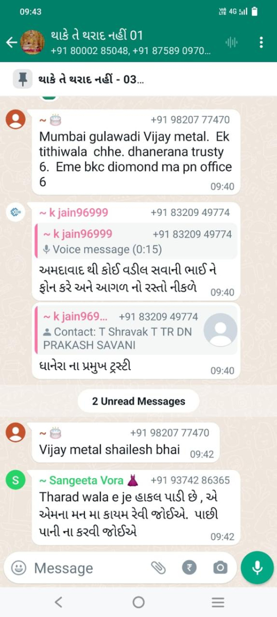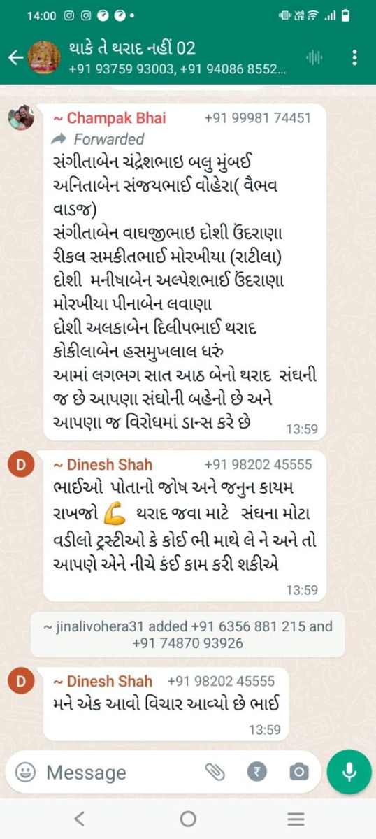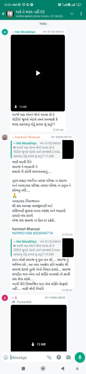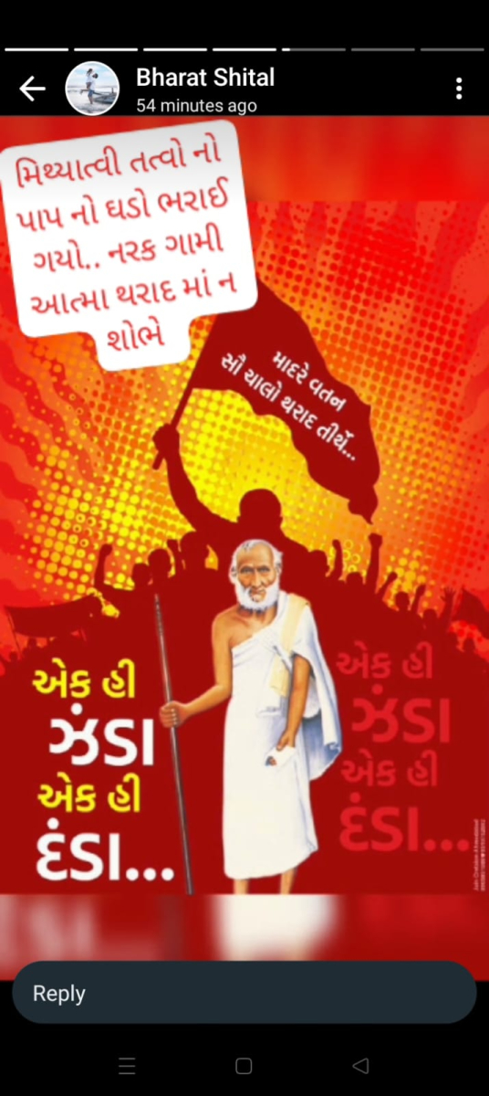 સાવ નીચલી કક્ષાના ઉશ્કેરણીજનક મેસેજના સ્ક્રીનશોટ ત્રિસ્તુતિક સમાજના નેજા હેઠળ ચાલતાં થાકે તે થરાદ નહીં, મારા ગુરુદેવ પ્રાણ પ્યારા થરાદ આદિ અલગ અલગ ગ્રૂપમાં બે તિથિ પક્ષ અને જૈનાચાર્ય માટે અનાર્યને પણ ના શોભે એવાં સાવ નીચી ભાષાના ઉશ્કેરણી જનક લખાણો….