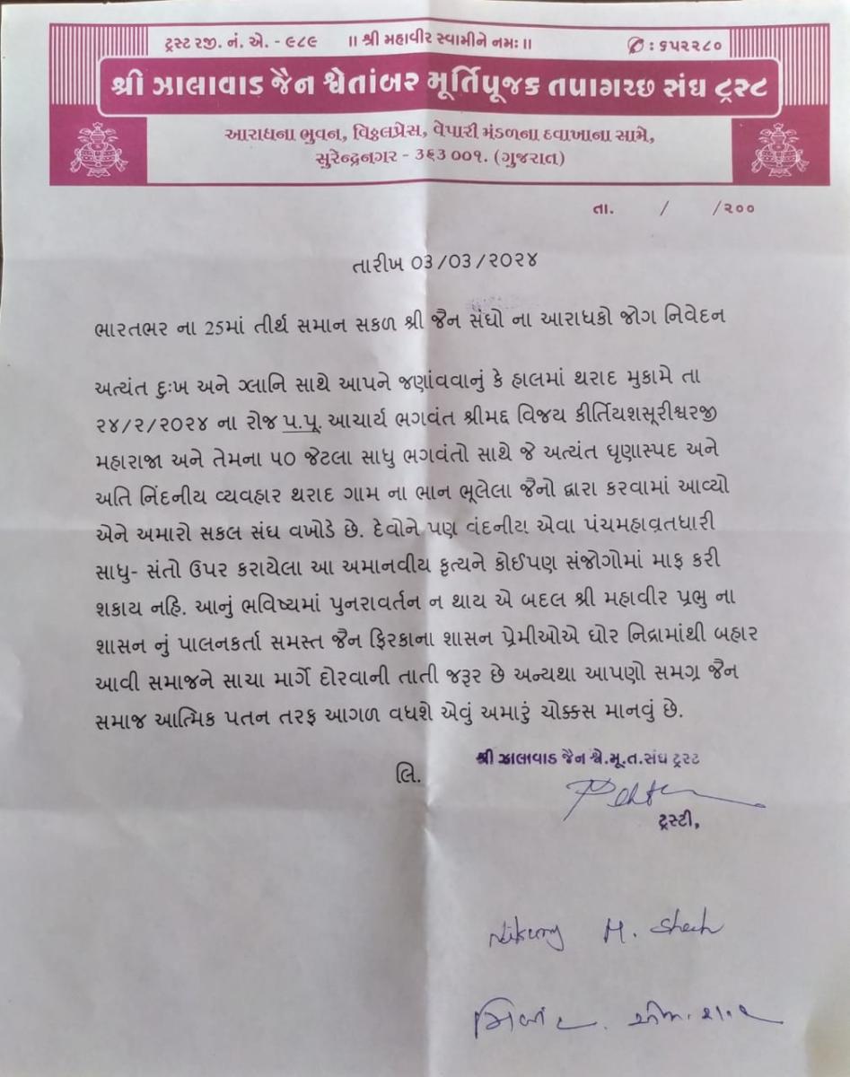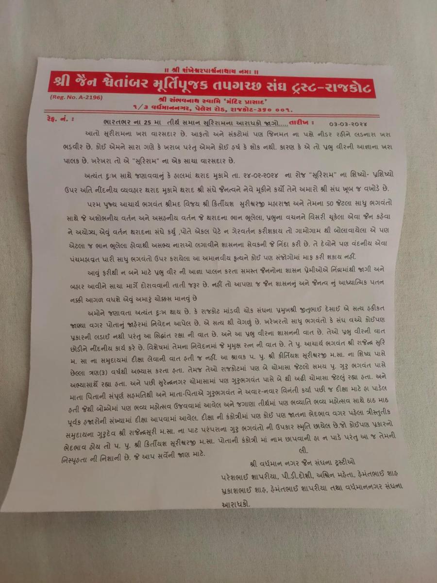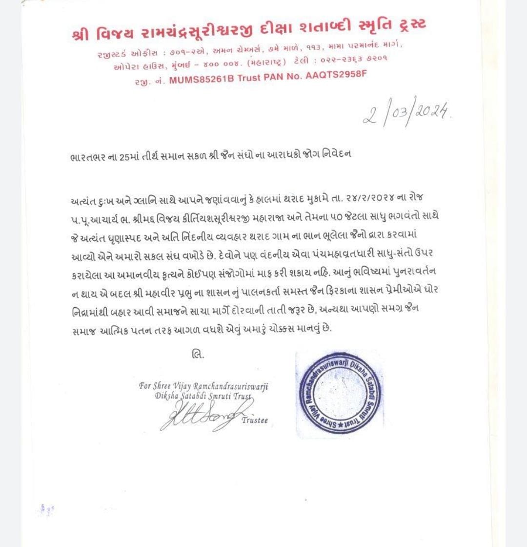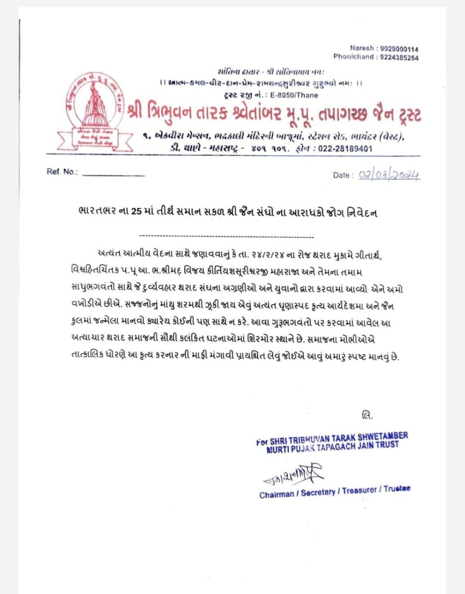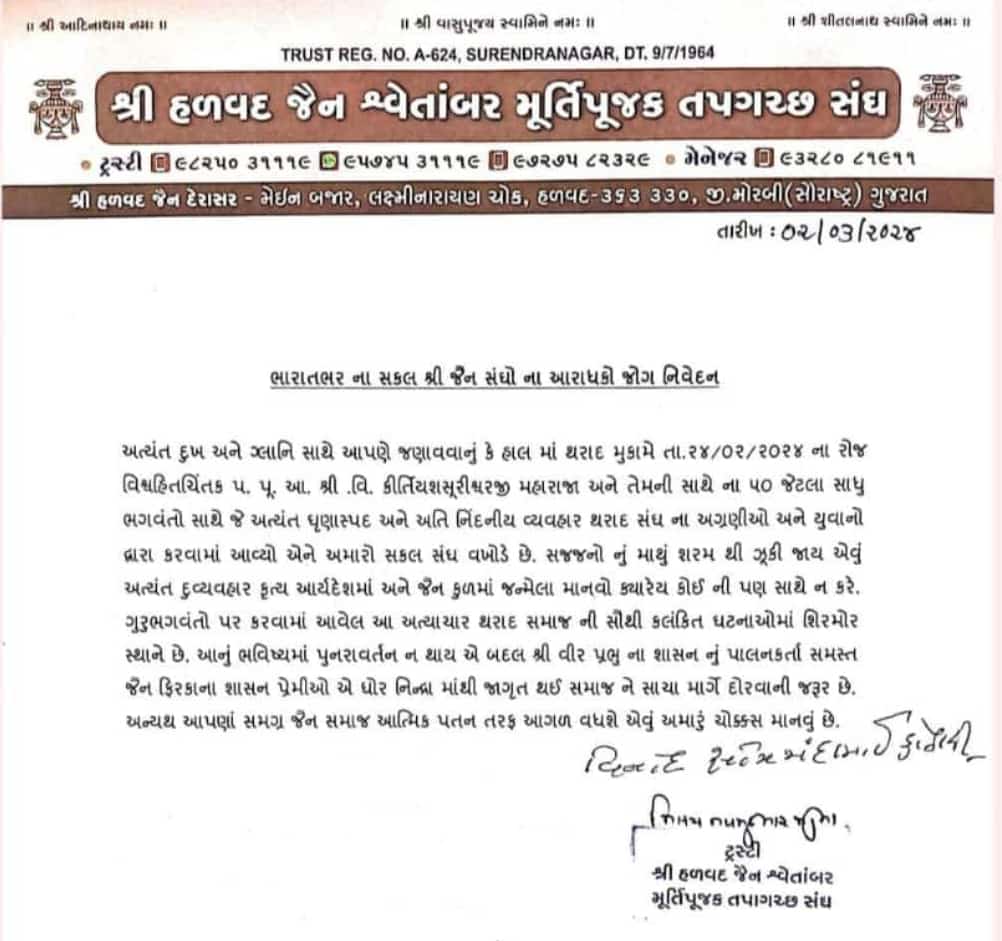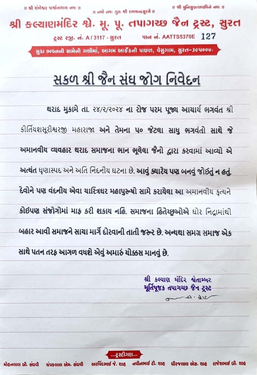 ત્રિસ્તુતિક દ્વારા છાપામાં અપાયેલ નિવેદેન