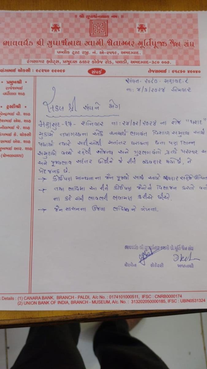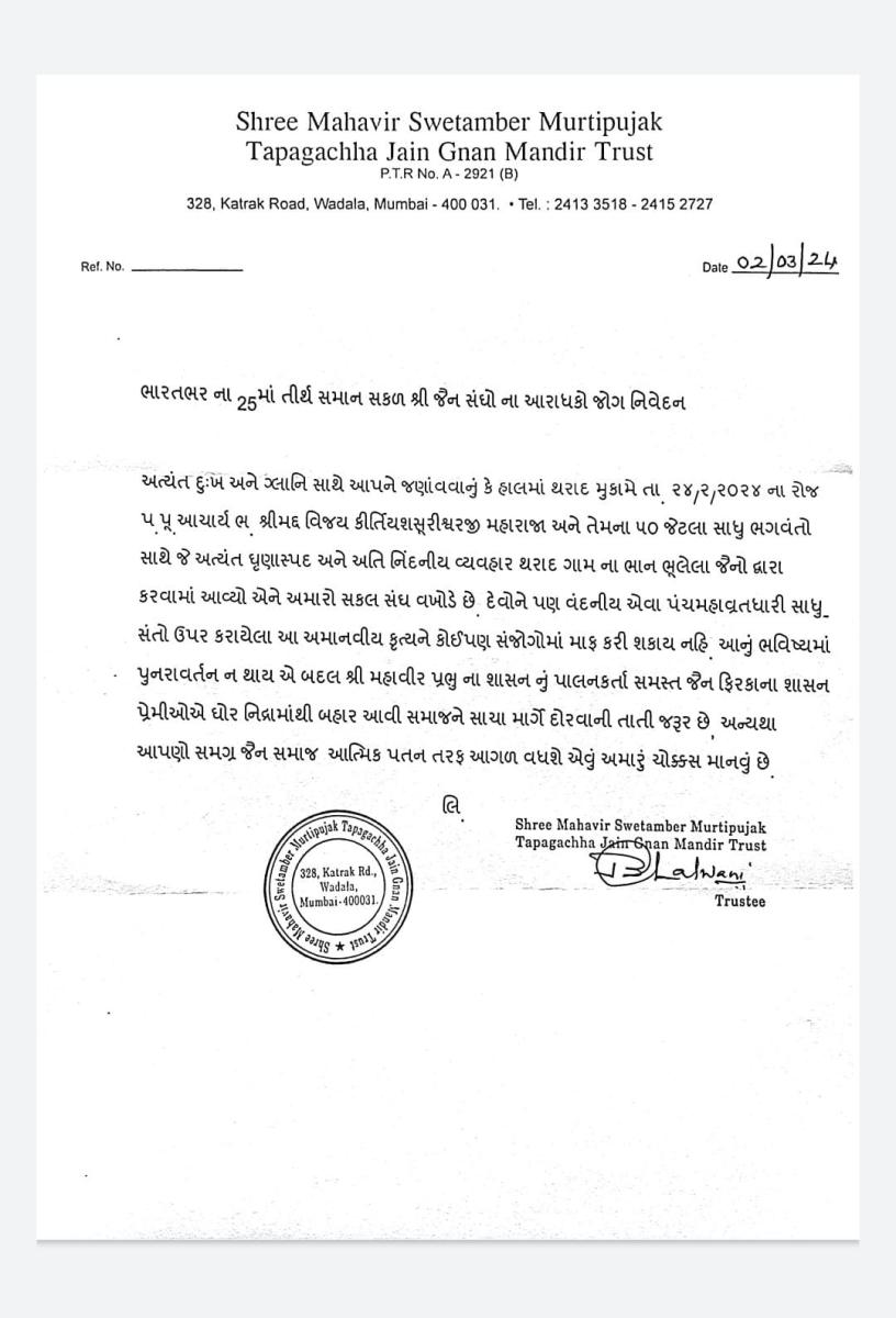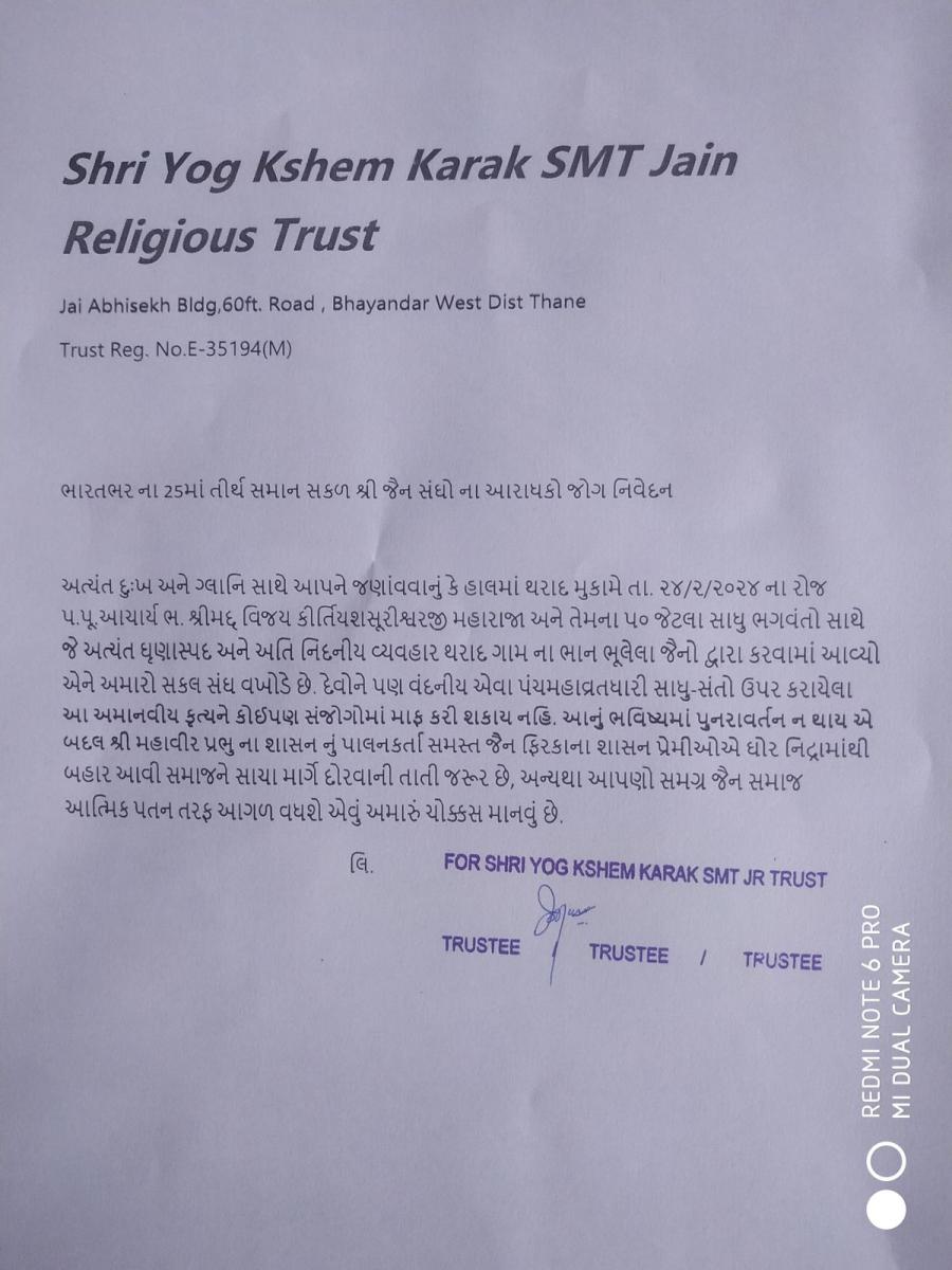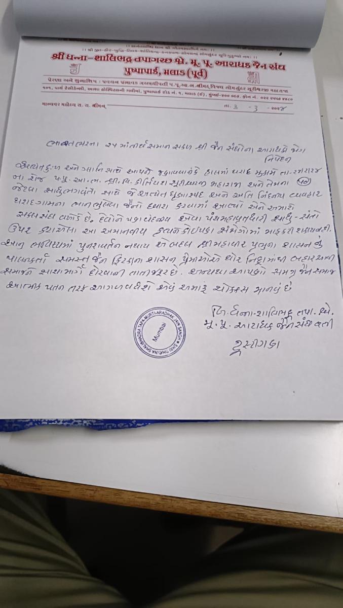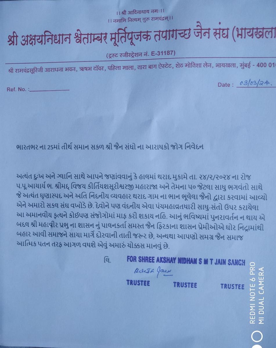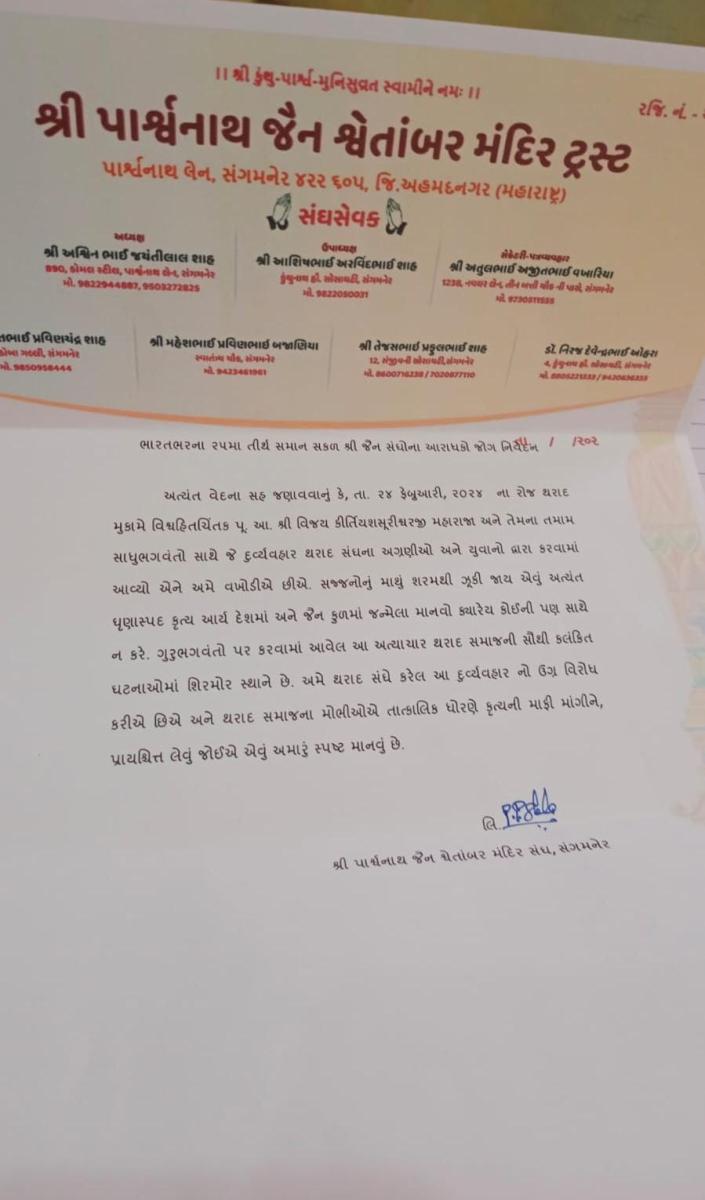 ત્રિસ્તુતિક દ્વારા છાપામાં અપાયેલ નિવેદેન